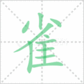 字典 雀的笔顺、笔画、写法、部首雀笔顺、写法:雀,拼音:què,笔画数:11画,部首:隹。中国一级汉字,编号2255。■ 基本字义• 雀què ㄑㄩㄝˋ• 鸟类的一科,吃粮食粒和昆虫。特指“麻雀”,泛指小鸟:雀跃(高兴得像雀儿那样跳跃)。雀盲(即“夜盲症”)。雀斑。雀噪(名声宣扬,含贬义)。■ 其它字义• 雀qiāo ㄑㄧㄠˉ• 〔雀子〕即“雀斑”。 ■ 其它字义• 雀qiǎo ㄑㄧㄠˇ• 义同(一),用于一些口语词:雀盲眼(即“雀(què )盲”)。家雀。雀的组词 雀的拼音