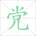 字典 党的笔顺、笔画、写法、部首党笔顺、写法:党(黨),拼音:dǎng,笔画数:10画,部首:儿。中国一级汉字,编号1885。■ 基本字义• 党(黨)dǎng ㄉㄤˇ• 为了政治目的结合起来的团体:党派。党团。党委。党员。党章。党阀。党风。党纪。• 意见相合的人或由私人利害关系结成的团体:党羽。朋党。死党。• 指亲族:父党。母党。妻党。• 古代地方组织,以五百家为一党。• 姓。党的组词 党的拼音